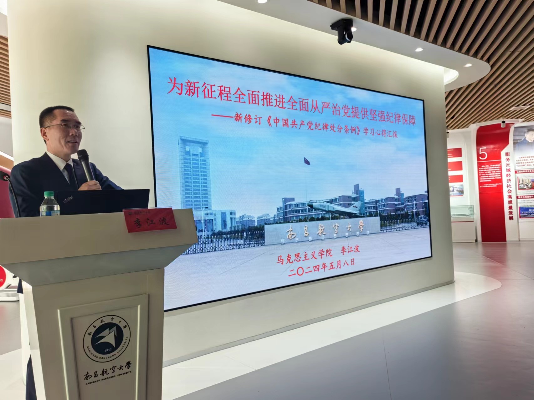 一次理论集中学习。5月8日上午,在党建创新实践中心先锋工作室,新时代赣鄱先锋、学校纪委委员、学院纪检委员、习近平新时代中国特色社会主义思想概论课教研室党支部书记李江波以“为新征程全面推进全面从严治党提供坚强纪律保障”为题,围绕“深刻认识修订《条例》的重要意义”“准确把握《条例》修订的主旨要义”“切实抓好修订《条例》的贯彻执行”进行了讲授,带领入党积极分子、学生党员尤其是毕业班党员集中学习《条例》,为大家上了一次廉政教育党课。他寄语毕业班党员,在人生道路上,要以坚定马克思主义信仰,牢固树立纪律意识,学纪、知纪、明纪、守纪,保持对纪律的敬畏之心,时刻遵守廉洁纪律,始终不越“雷池”、不踩“红线”、不破“底线”。