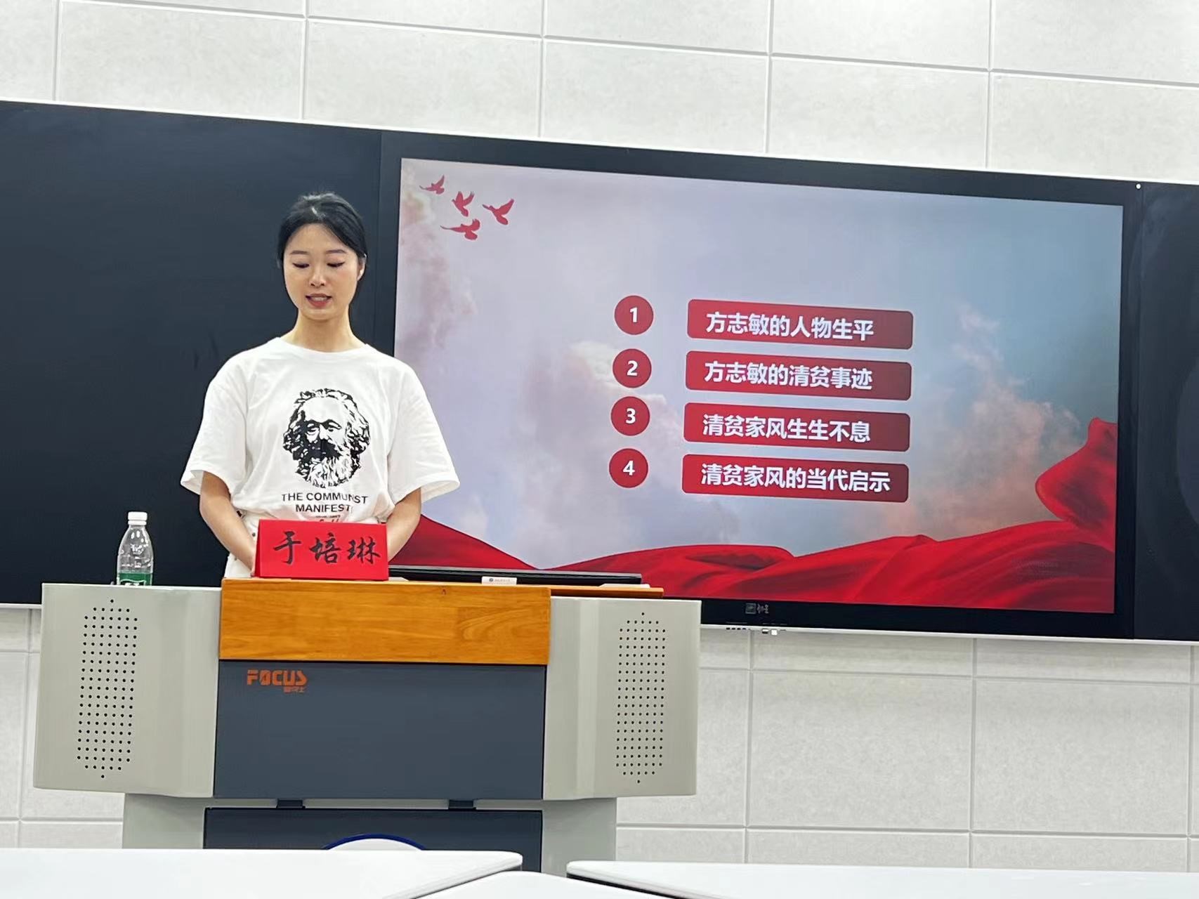 一次红色家风洗礼。为弘扬传承中华优秀传统,感受老一辈革命先烈优秀品质,传承红色家风,营造崇廉尚洁,风清气正的环境,5月8号下午,研究生知行宣讲团成员学院2023级研究生于培琳在大活345智慧教室为全体学生党员以“清贫家风代代传”为题,围绕“方志敏的生平和清贫事迹”“清贫家风生生不息”“清贫家风的当代启示”讲述了无产阶级革命家方志敏为党的事业和人民群众的利益,始终严于律己,甘于清苦、清贫朴素的一生以及家人继承先辈遗志,弘扬清贫家风的故事。清贫的家风,是方志敏一生最鲜明的品格风范,是他一生大义担当的生动写照,是中国共产党的传家法宝,是中国共产党人永志不忘的红色血脉。其高尚廉洁的品格和清正廉洁、安贫乐道的奉献精神激励着师生决心要继承先烈遗志,保持优良作风,为建设“可爱的中国”而贡献自己的力量。