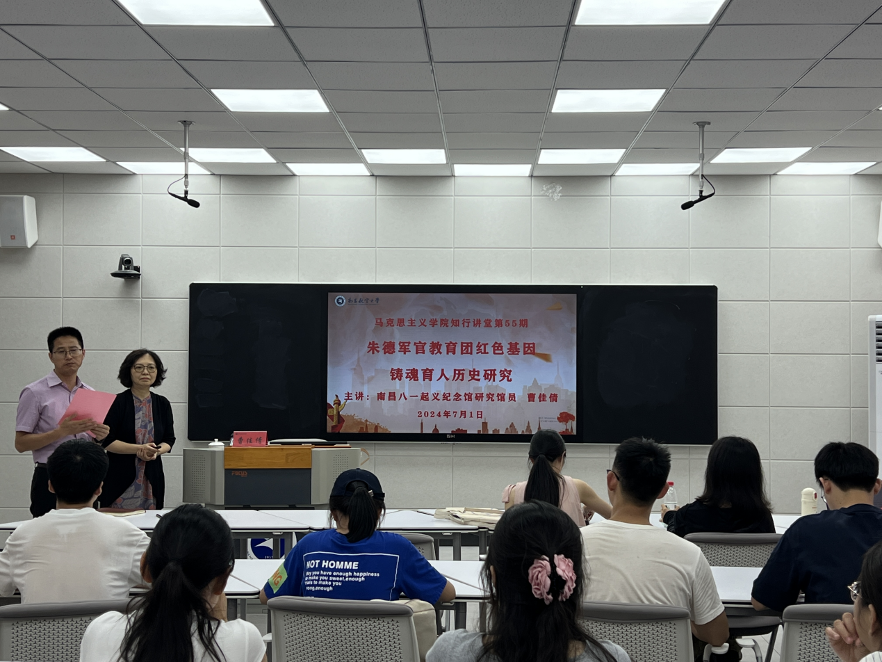为庆祝中国共产党成立103周年,弘扬伟大建党精神,赓续红色血脉,传承红色文化,引导青年大学生厚植爱国主义情怀,7月1日下午,在南昌航空大学马克思主义学院智慧教室大学生活动中心345教室,南昌八一起义纪念馆副研究馆员曹佳倩受邀做客第55期“知行讲堂”,为马院师生开展专题讲座。此次讲座由南昌航空大学马克思主义学院副书记万勇平主持。